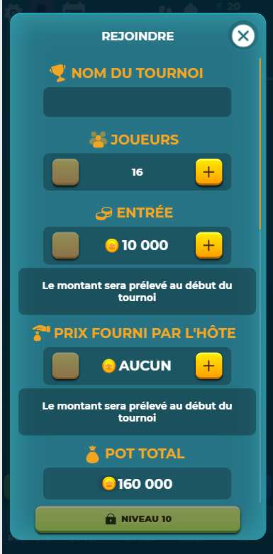 • Once the tournament is created, the host may leave the table and act only as the organizer without playing.