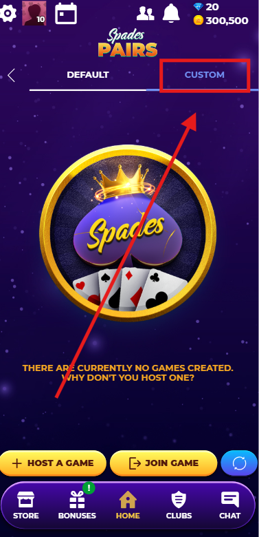 To access it, go to the Tournaments section and select Custom (next to the Default option).