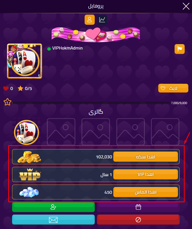 "برای ارائه ژتون ، عضویت VIP یا سنگهای قیمتی به بازیکن دیگر: