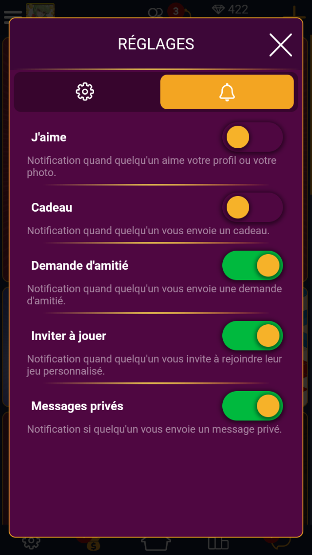 Si vous voulez désactiver les notifications que vous recevez chaque fois quand qqn. aime votre profil, vous envoie un cadeau, vous devriez: