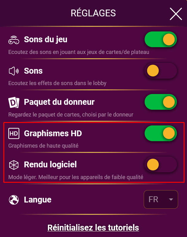 3. Modifiez les ''Graphismes HD'' et les réglages du ''Rendu logiciel'' et réessayez.
