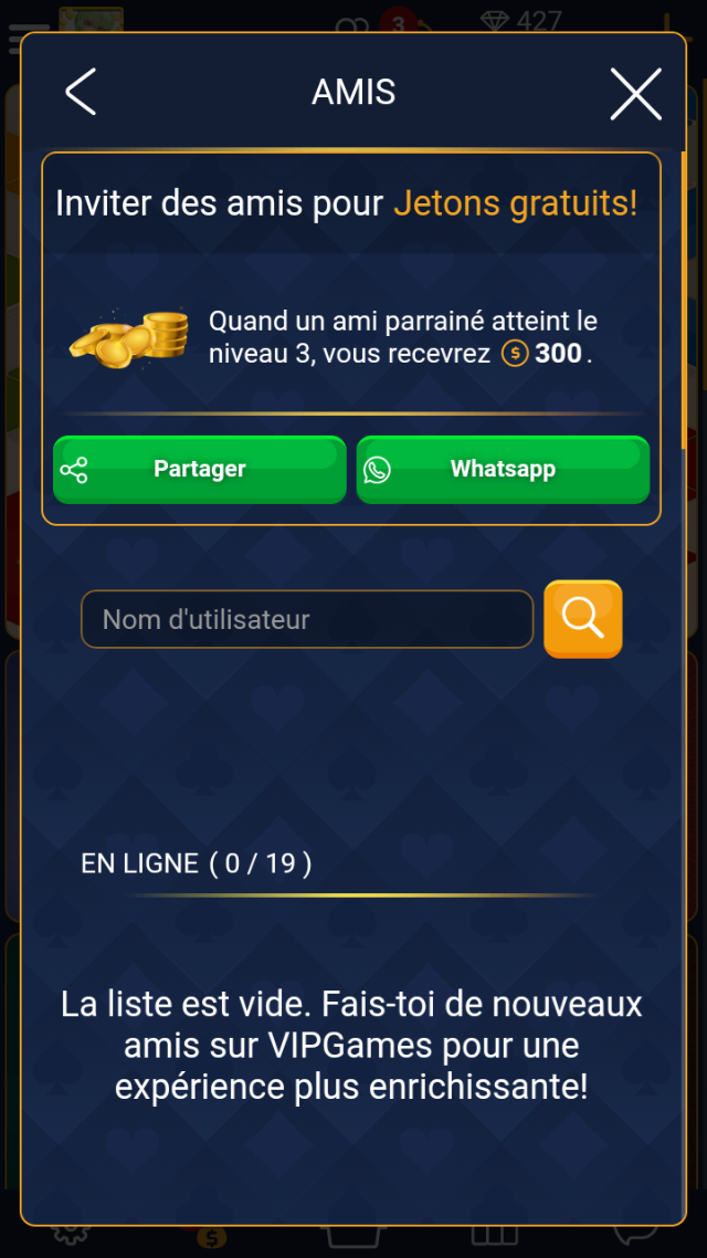 - Si vous choisissez le bouton de "Whatsapp" à droite, vous verrez un nouvel écran pour choisir ces amis de Whatsapp auxquelles vous pourriez envoyer une invitation. Ils recevront une notification depuis laquelle ils pourront s'inscrire dans le jeu.