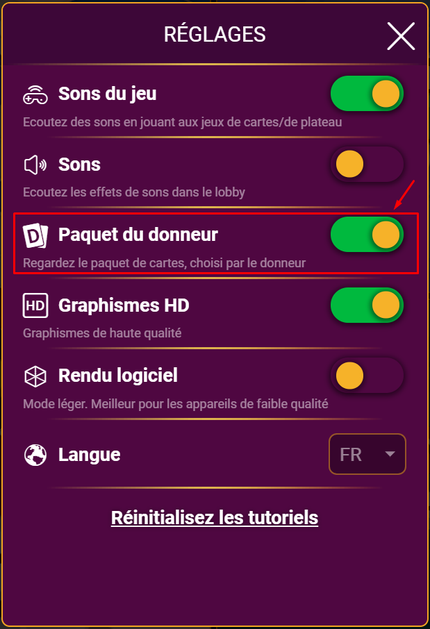 Pour tous les utilisateurs ayant activé l'option "Paquet du Donneur", le jeu sera joué par le paquet personnalisé du donneur. Cela signifie qu'à la fin de chaque partie les tours du donneur alternent, se succèdent, ainsi que le paquet du donneur.
