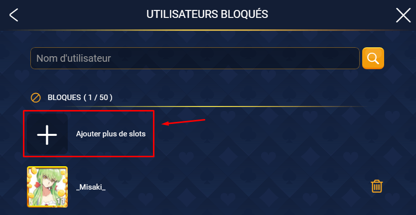 Vous pouvez bloquer jusqu'à un certain nombre de joueurs. Si vous désirez bloquer plus grand nombre de joueurs, vous pourriez échanger des gemmes contre des places de blocage supplémentaires (slots).
