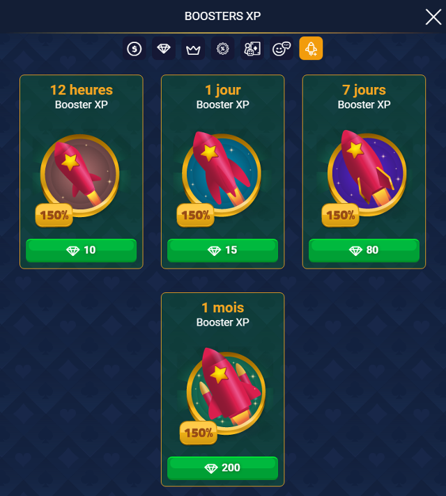 Le XP Booster coûte des gemmes et sa durée varie. Une fois acheté, ce pproduit s'active immédiatement et il ne peut pas être désactivé. Si un utilisateur possède un XP booster actif, et en achète un nouveau, la durée augmentera.